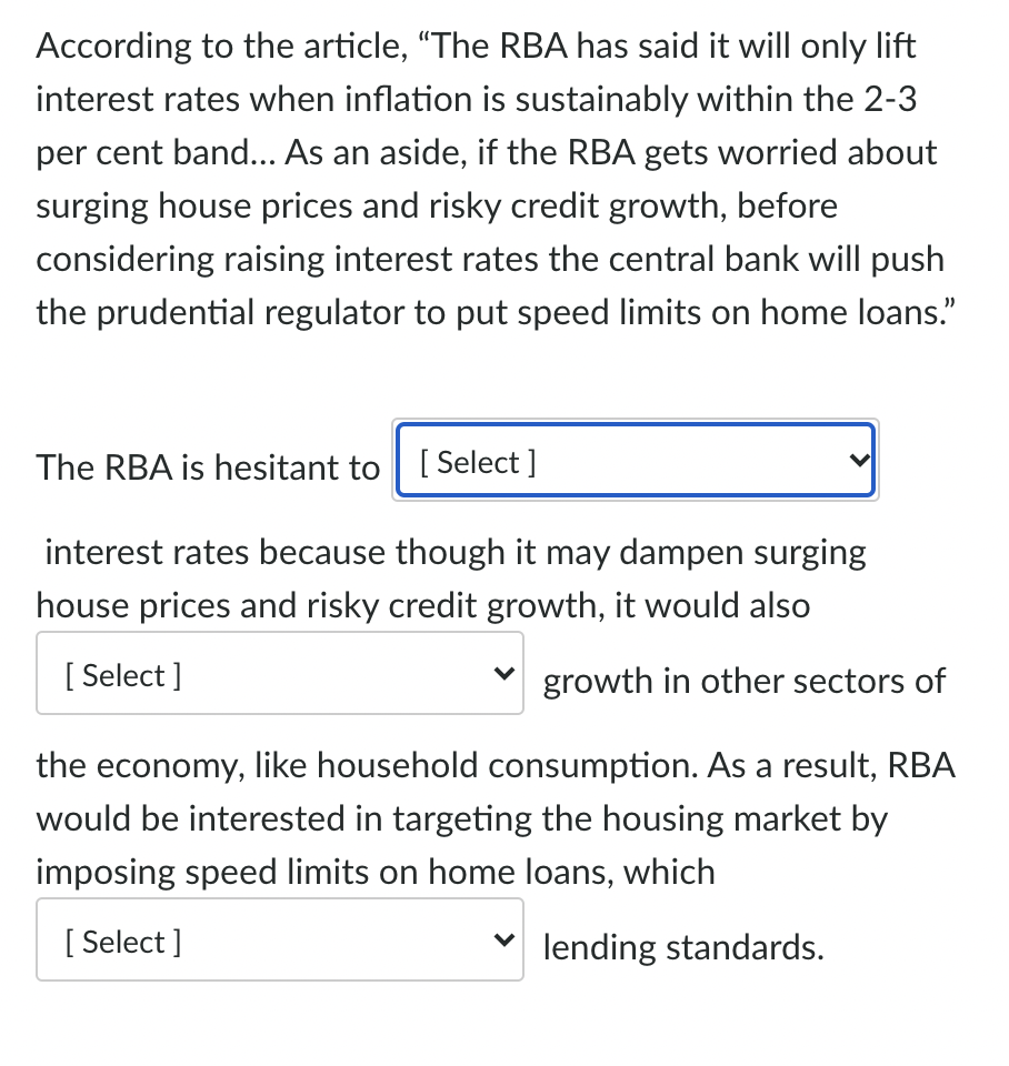 Solved According To The Article The Rba Has Said It Will Chegg Com